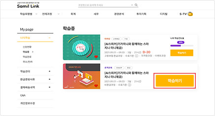 2MY캠퍼스 > 학습현황메뉴 > 학습중 탭에서 신청 과정 학습하기 버튼 클릭